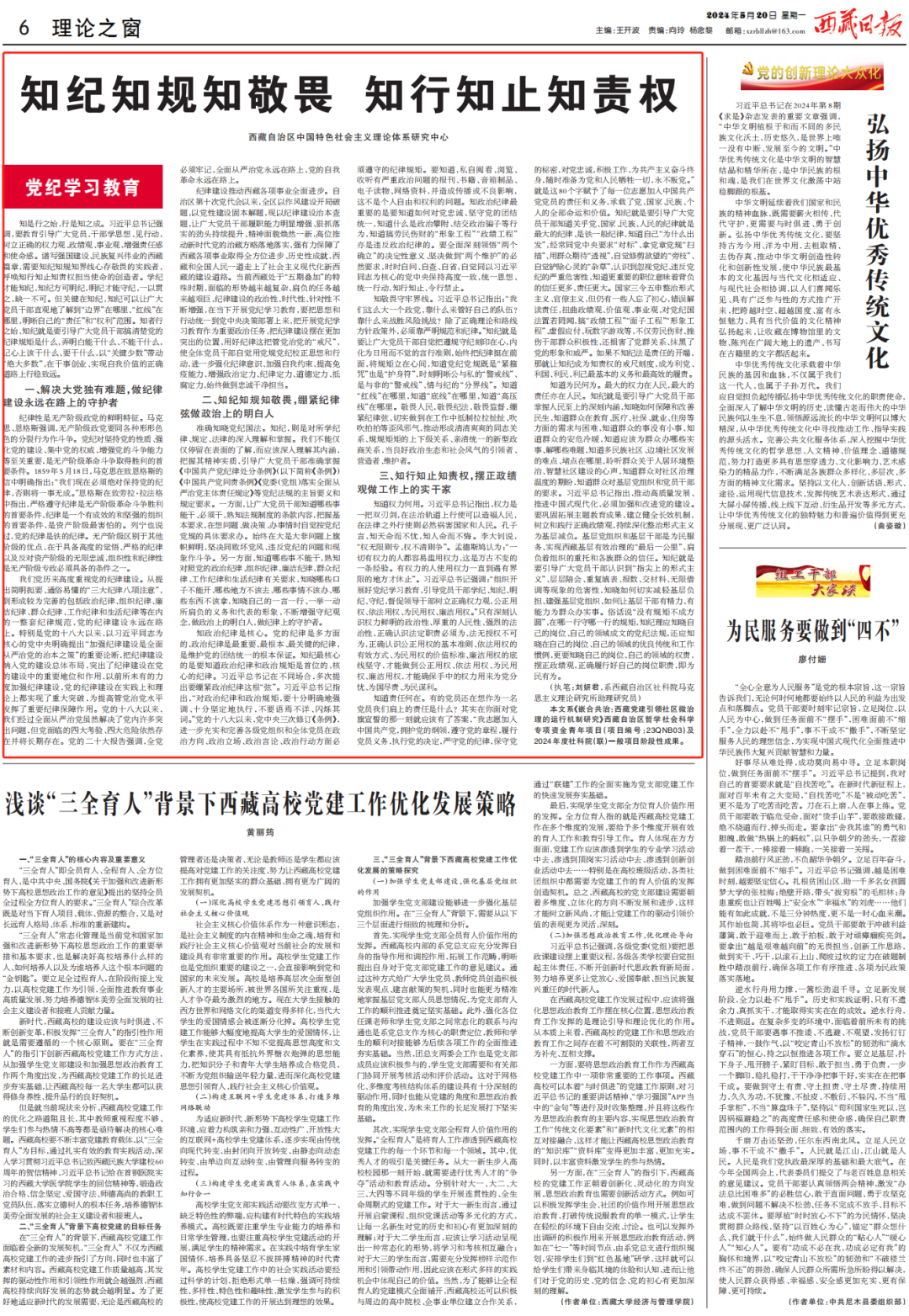 知是行之始,行是知之成。习近平总书记强调,要教育引导广大党员、干部学思想、见行动,树立正确的权力观、政绩观、事业观,增强责任感和使命感。谱写强国建设、民族复兴伟业的西藏篇章,需要知纪知规知界线心存敬畏的实践者,呼唤知行知止知责权担当使命的创造者。学纪才能知纪,知纪方可明纪,明纪才能守纪,一以贯之,缺一不可。但关键在知纪,知纪可以让广大党员干部直观地了解到“边界”在哪里、“红线”在哪里,明晰自己的“责任”和“权利”范围。知者行之始,知纪就是要引导广大党员干部搞清楚党的纪律规矩是什么,弄明白能干什么、不能干什么,记心上该干什么、要干什么,以“关键少数”带动“绝大多数”,在干事创业、实现自我价值的正确道路上行稳致远。
